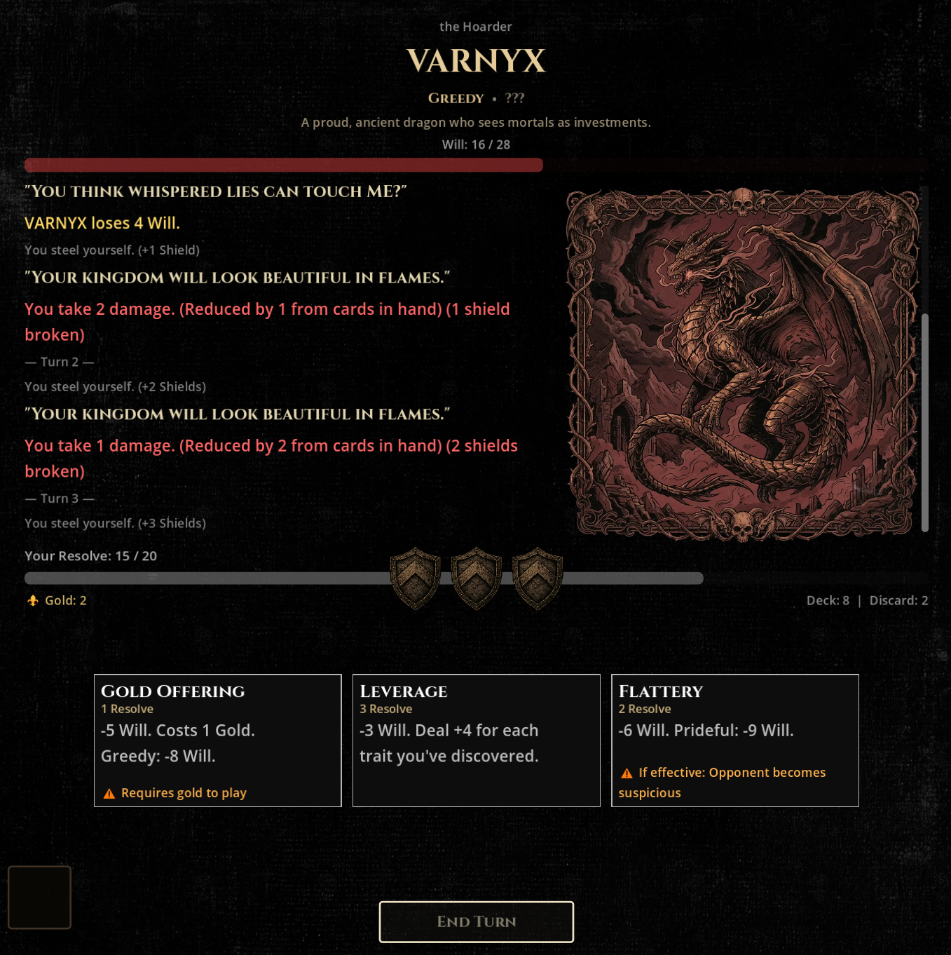 You are a rugged diplomat. Your kingdom sends you to face ancient powers, not with an army, but with rhetoric, flattery, threats, and the occasional bribe. Reduce their Will to zero before your Resolve breaks.