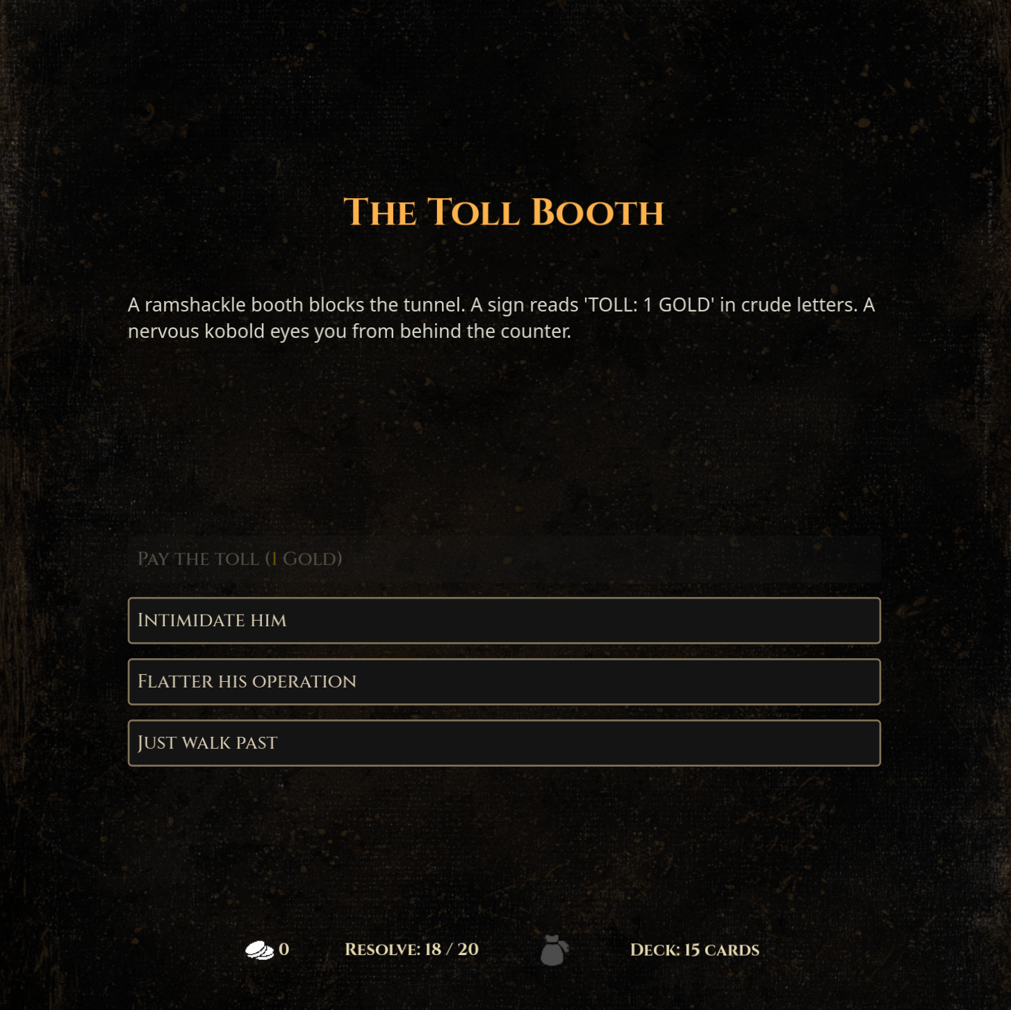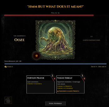 Every word costs something. Cards drain your Resolve, the same resource that keeps you alive. Spend too freely and you won't survive the retaliation.