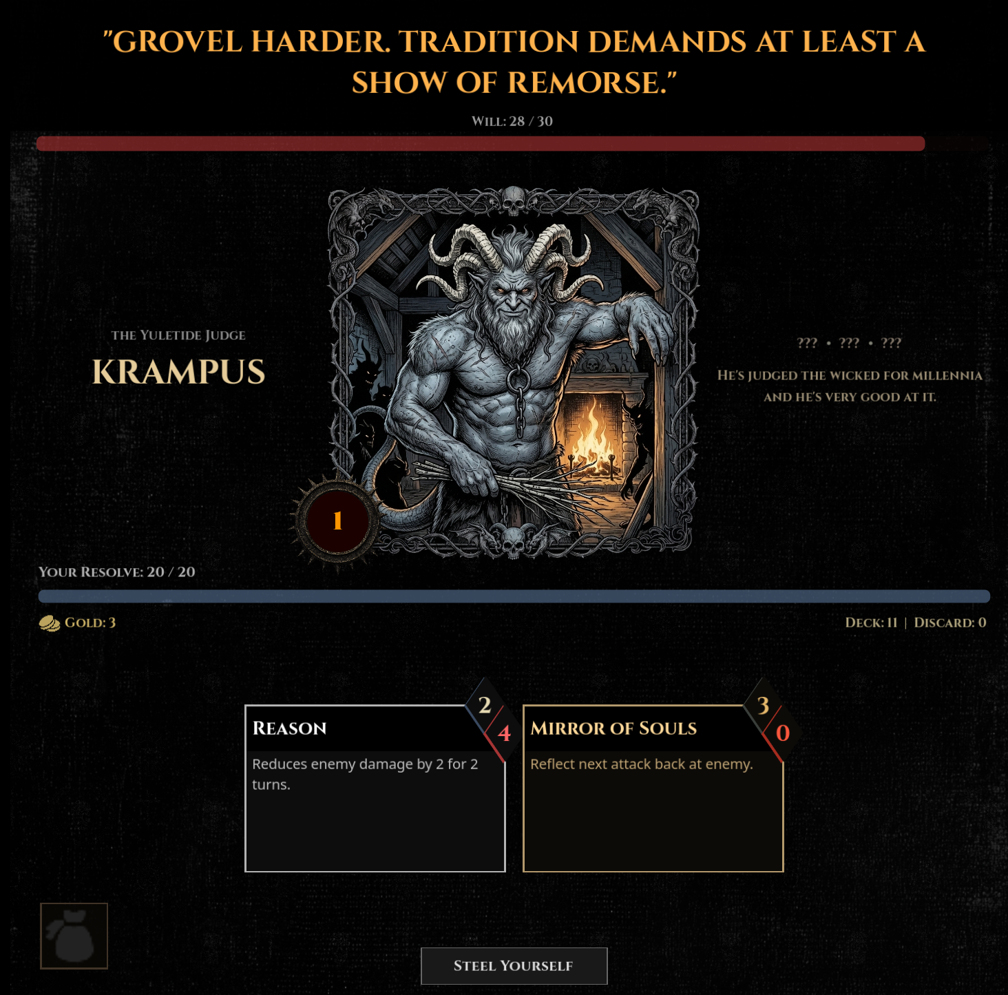 I really enjoyed how the dialogue from the enemies would reflect their traits and the gameplay loop was very fun! However, the boss run at the end seems a little bugged since it keeps randomly starting the other acts after defeating a boss and then exits the boss run if you complete the act. And the scaling of the game in browser isn't that great either even in full screen. For example, when I leveled up and unlocked the merchant class, I couldn't scroll down to hit continue because the class pushed the continue button off the edge of the screen even at full screen. But the concept and the little details with the dialogue really sold the game in my opinion!